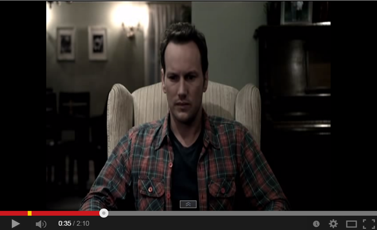 This is a long shot of a dark and spooky looking hallway, the audience will be looking straight to the bottom of the hallway intriguing them and keeping their focus on the grandfather clock. This is followed by the diegetic pendulum sound starting again and the diegetic dialogue from the paranormal investigator "Its not the house that's haunted, it's your son". This shot is followed by a series of very fast paced cuts showing close ups of the fear in different character's faces. The trailer appears to have ended but then a close up of a demon's face jumps up on screen which is there to give the audience one final scare.